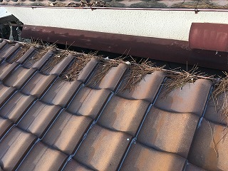さっそく屋根に登ってみると、瓦の隙間という隙間に大量の松葉が入り込んでいました。