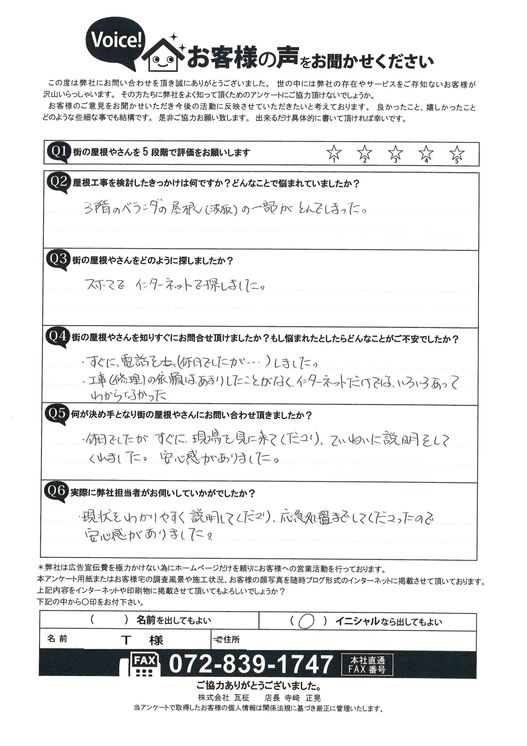 寝屋川市 3階のベランダ波板工事を行いましたお客様の声をいただきました
